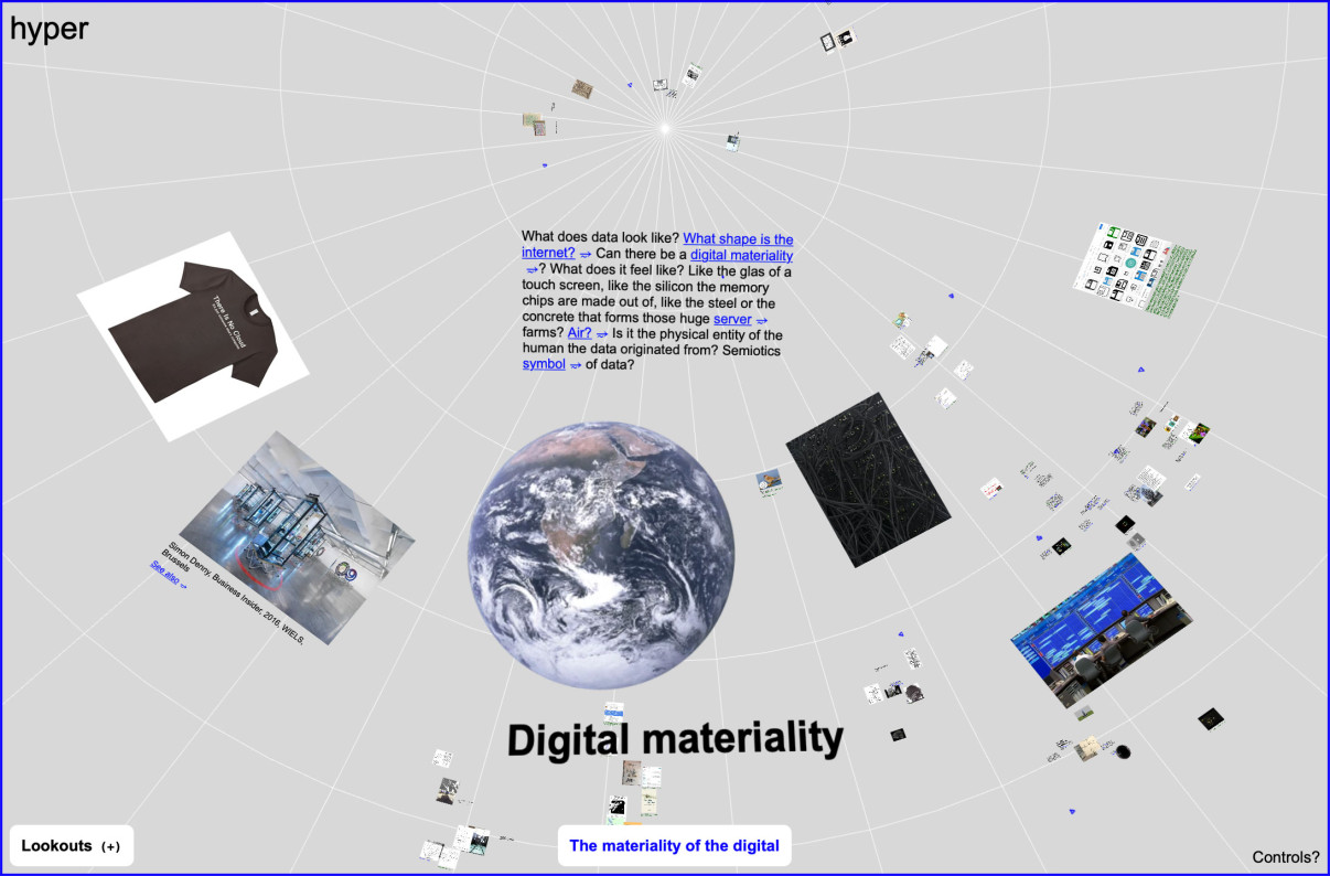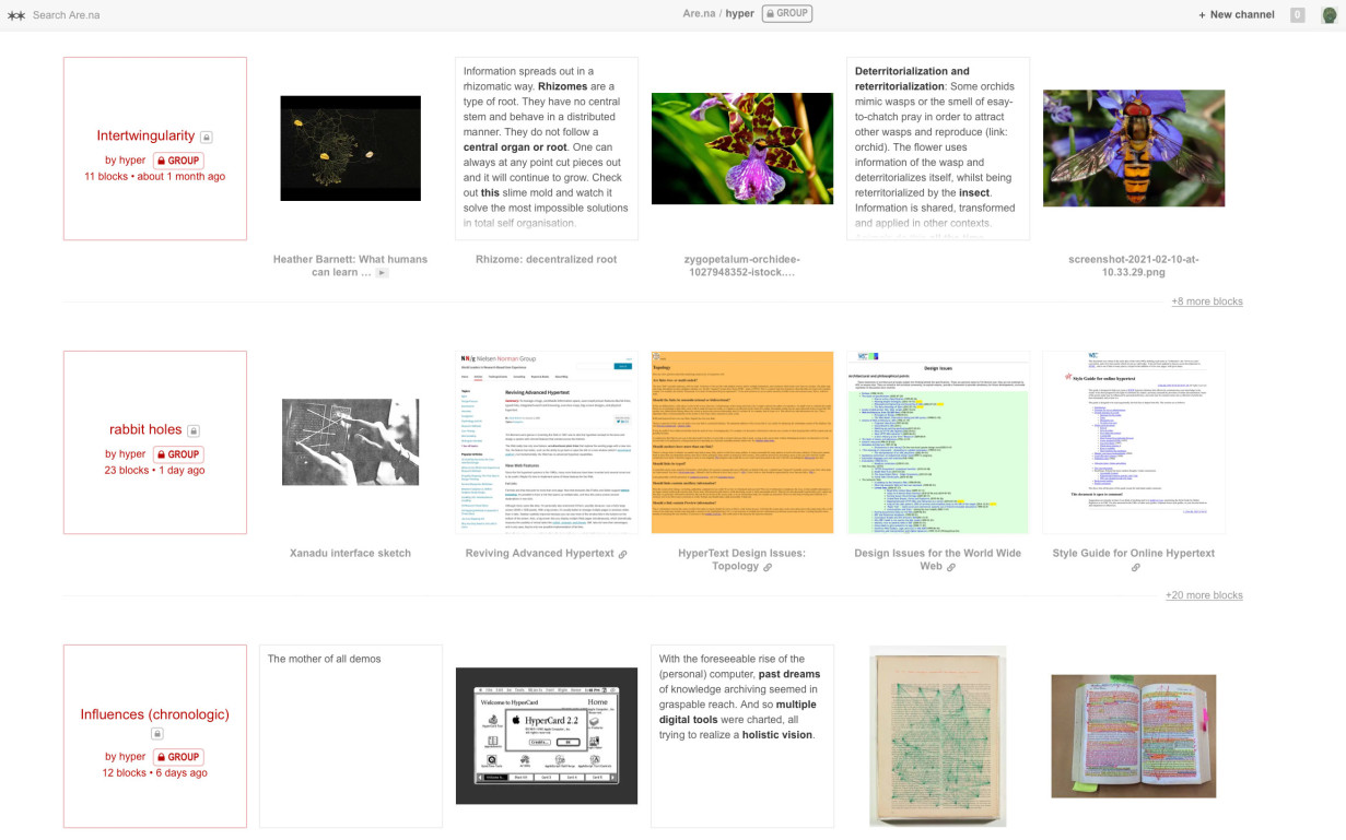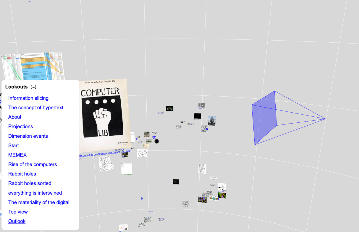 , 2021Motivated by previsions ideas from various internet pioneers on knowledge narration, like Ted Nelson, HYPER is a tool for building 'thought-spaces' by making relations and interlinkedness visible. It tries to break apart the WWWs core aesthetic, that is rooted in screen bound two-dimensionality. The content is managed via Are.na, a popular research and colaboration platform.
