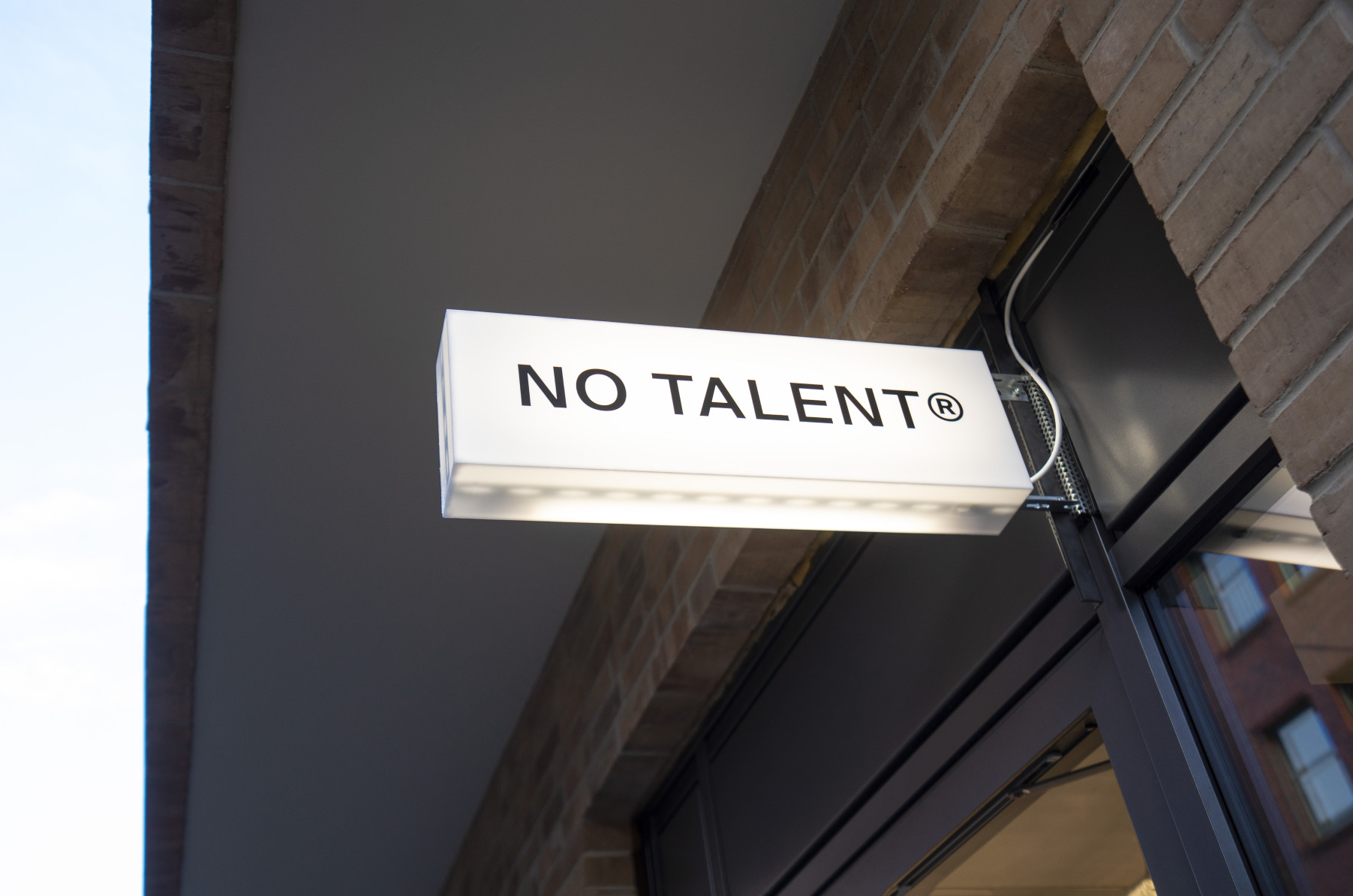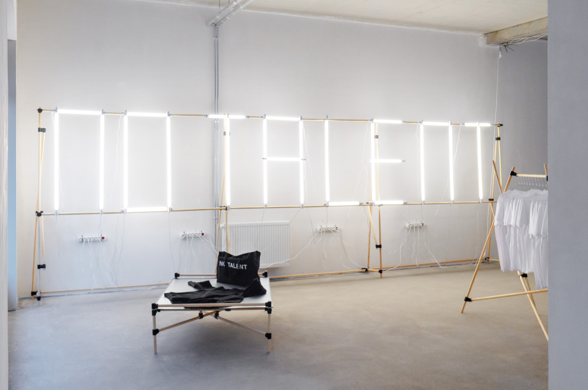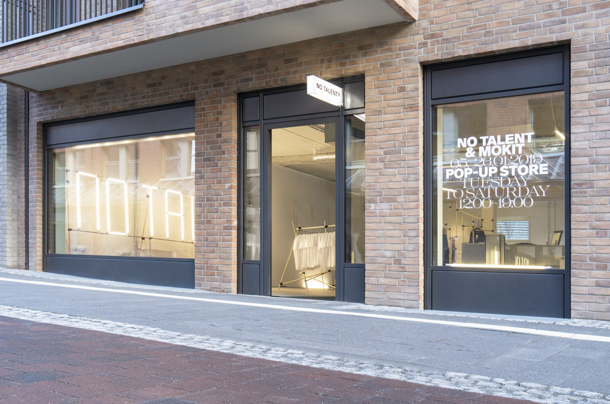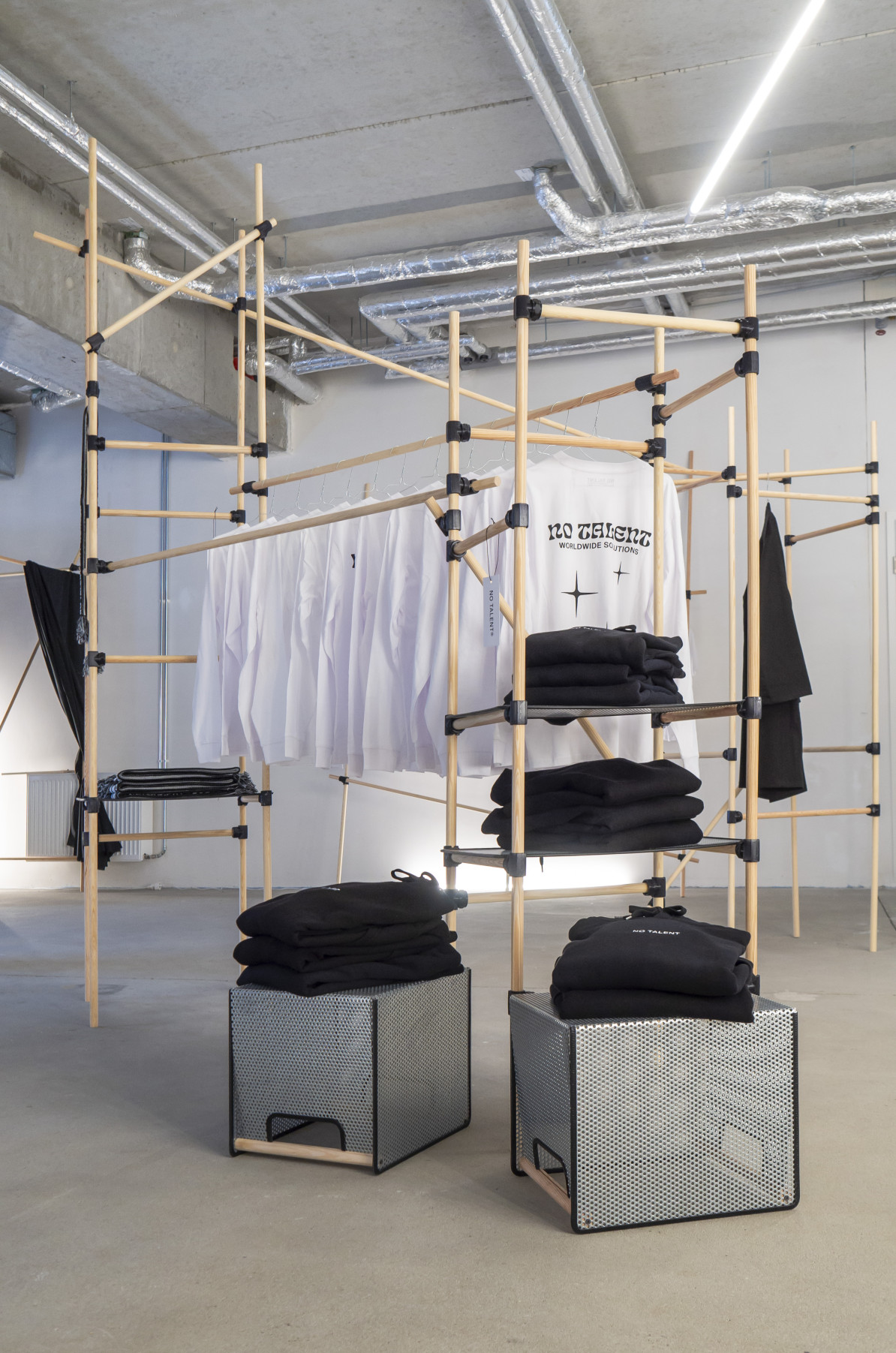 , 2019A pop-up-shop for the german streetwear label and design office NO TALENT with the MOKIT furniture system. A fitting match due to the very much reduced aesthetic of both visual languages: Black and white clothes and bare materials.