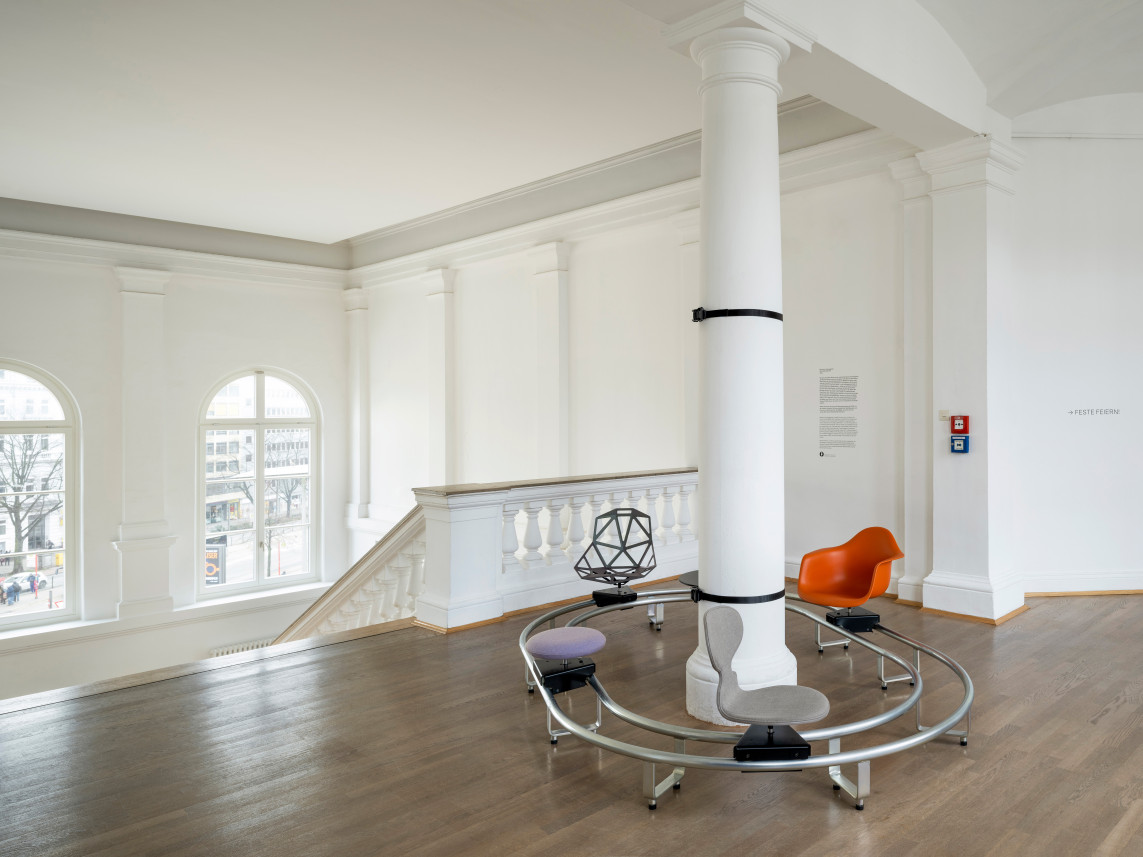 The four seats are rotatable and can be moved or even raced along a rail. The table light in the middle of the oval can also be used to charge mobile devices. The mounted classic chairs are a tribute to good design and tie into the permanent design collection of the museum: Ant by Arne Jacobsen, Chair_One by Konstantin Grcic and the Plastic Arm Chair by Ray und Charles Eames, to which a simple round seat of own design is added.